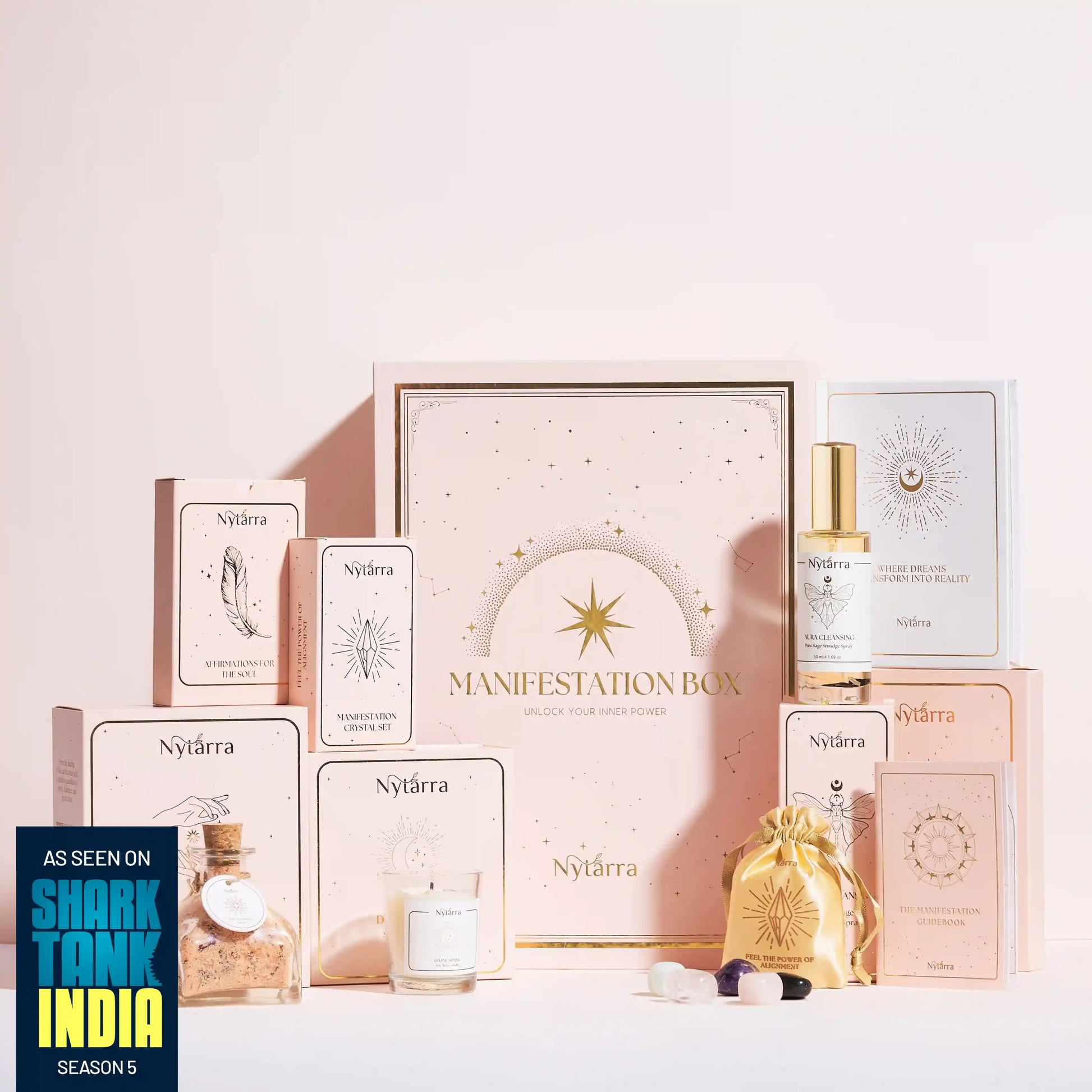 The box includes a Divine Spark Candle, Aura Cleansing Salts, Energy Clearing Smudge Spray, five charged crystals, a set of affirmation cards, a manifestation journal and a step by step guidebook to help you perform the rituals with ease.