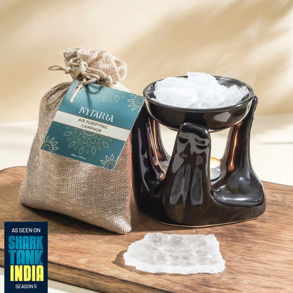 A pure camphor ritual paired with a handcrafted clay diffuser to gently cleanse and calm your space. A simple way to refresh your space and invite mindful, soothing energy in. Suitable for: Homes, Workspaces & Rituals Key Benefits: Natural Air Purification & Insect-Repellent Properties | Pure & Adulterant-Free Contents: 1 Aroma oil Diffuser + 200 Gram Air Purifying Camphor